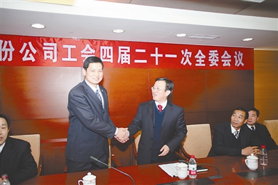 冀中能源股份公司党委副书记(原工会主席)宋仁涛(右),向首位农民工工会委员焦志勇表示祝贺