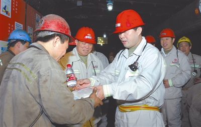 冀中能源集团、冀中能源股份公司董事长、党委书记王社平(右)春节到井下慰问农民工