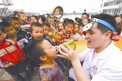 9月27日,四川省华蓥市三圣小学的留守儿童在接受医务人员免费口腔检查。