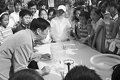 ▶近日,在北京市朝阳区茉藜园社区举行的“坚持科学发展,节约保护水资源”的全国科普日活动现场,一系列关于水资源合理利用的科普展板,以及诸多互动活动深深吸引了社区的群众,尤其是孩子们。图为年过七旬的科普志愿者李老师正在绘声绘色地讲解趣味水科学小实验。颂安 摄