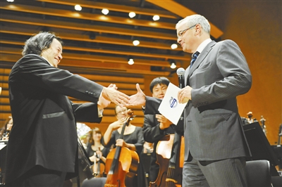图为沃尔沃CEO雅各布(右)向汤沐海祝贺演出成功。本报记者 姜文良 摄
