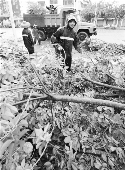 9月30日,文昌市园林局的工作人员在清理被台风吹断的树枝。