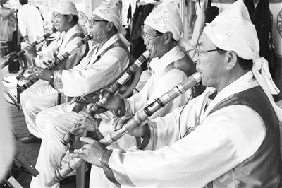 9月25日,来自延边的演员在演奏洞箫。当日,吉林省“延边国贸农业科技文化园”举行开园一周年庆祝活动。