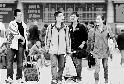 10月7日,哈尔滨火车站外,几名旅客拎着大包小裹,高高兴兴地走出站台。