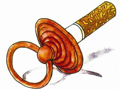 这是一件绝妙的戒烟专用品。漫画作者没有告诫人们如何克制自我,用调侃式的“发明”让烟民有了经济耐用的替代产品。