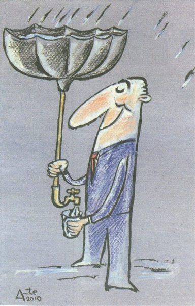 全球气候变暖,自然灾害不断,水资源十分匮乏。这位先生巧借改装的雨伞收集饮用水,但愿我们千万别“走”到这一步……