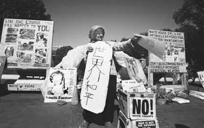 10月5日,坚守在美国白宫前30年反战的美国女子皮奇奥托看到一队中国游客到来时,立即从白色塑料布支起的帐篷前拿起了一块用中文写有“世界和平”字样的纸板示意,并将书写着反战的材料向游客分发。1981年她与威廉·托马斯共同发起白宫“反核和平守夜”活动。从那时起,她一直驻扎在白宫对面宾夕法尼亚大街的拉法耶特公园人行道边,呼吁维护世界和平。她日夜居住的白色帐篷内摆有一把坐椅,周边堆放着杂物,被人们戏称为美国总统“最近的邻居”。据介绍,皮奇奥托有四个儿子,其中三个死于美国参加的战争中。本报记者 于文国 摄