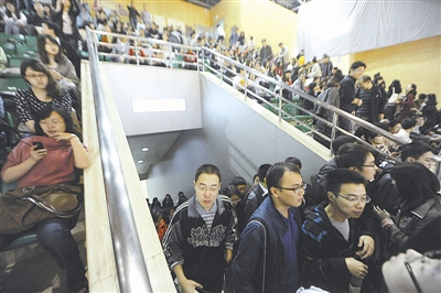 10月10日上午,中央机关公务员招考宣讲会在中国人民大学举行,因听讲学生太多,会场临时转到该校世纪馆进行。2012年国家公务员考试即将启动,据相关部门透露,2012年的国家公务员考试对外招录的部门有130个,共18000个职位,县区级基层职位13000个。法万 摄