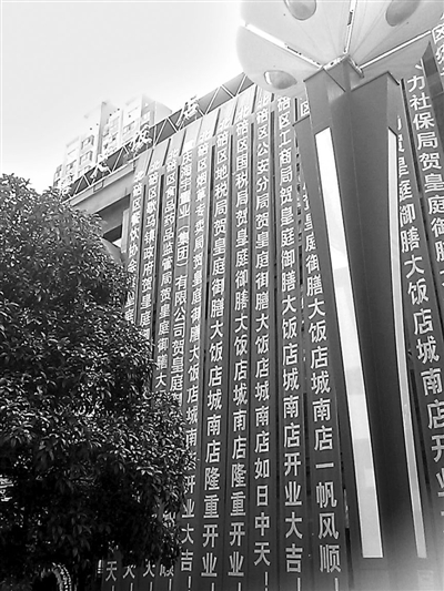 国庆节期间,重庆北碚新区步行街一酒楼新开张,酒楼门面从上至下悬挂的近100条祝贺条幅大多来头不小——区财政局、区建委、区商委、区安监局、区统计局、区人社局……
