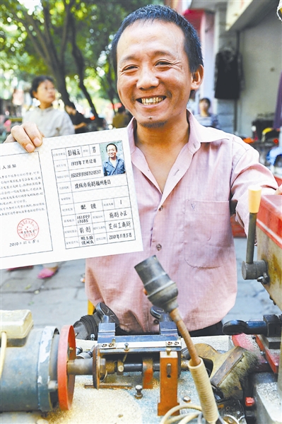 10月11日,福建省建瓯市福州巷居民彭禄元在家门口配锁摊前展示《就业备案登记证》。