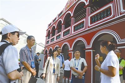 小楼的整体外观是红墙白柱,画有白色边线,楼房上下层各有七个赭红色的装饰性拱门,完全是一副西式建筑的风格,但一旦进入里面又发现青砖墙、木雕椅、供神台,长对联,屋内全是民清时的布置和摆设,完完全全变成中国的古代民宅,仿若时光倒流回到亘古,着实让游人们惊叹不已。