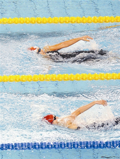 当日,在江西奥林匹克体育中心游泳跳水馆进行的第七届全国城市运动会游泳项目女子400米个人混合泳决赛中,杭州选手叶诗文以4分33秒66的成绩获得该项目冠军,长沙选手李玄旭以4分34秒33的成绩获得该项目亚军。 新华社记者 徐昱 摄