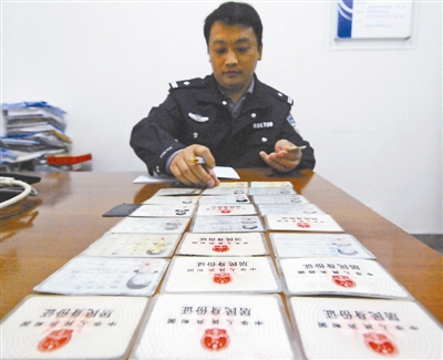 图为10月24日,江西九江市庐山南路派出所民警在整理第一代居民身份证。 新华社发 (胡国林 摄)