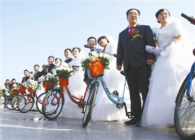 当日,山东聊城市7对新人举行自行车集体婚礼,迎亲队伍由近百辆自行车组成。这种健康环保、时尚快乐的绿色出行生活方式吸引了众多市民驻足。新华社发(孔晓政 摄)