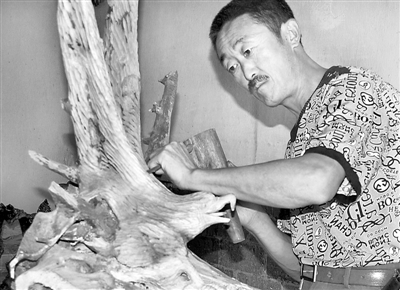 10月15日,黑龙江八五二农场下岗工人扬玉林正在雕刻自己的根雕作品。近年来,黑龙江省八五二农场广开创业门路安置下岗工人再就业,开办书画、版画、美术等培训班。在此基础上,农场各级工会组织还帮助引导一些职工从事雕刻、根雕艺术。在不断增加经济效益的同时,为众多旅游观光爱好者提供艺术享受。 邵维信 张丽艳摄