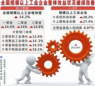 据国家统计局统计,前三季度,全国规模以上工业增加值同比增长14.2%,其中一二三季度分别增长14.4%、14%和13.8%,增速逐季放缓。