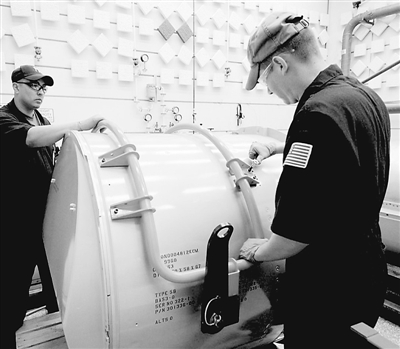 10月25日,美国最后一枚冷战时期存放至今的B53核弹被拆除,这种堪称美国威力最大的核武器就此寿终正寝。图为在美国唯一核武器组装拆卸工厂——得克萨斯州潘特克斯核工厂,工人正在处理待拆的B53核弹。谢涛 供图