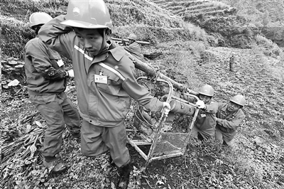 ④ 山中没有道路,几百斤的设备上山全靠工人们的肩膀。