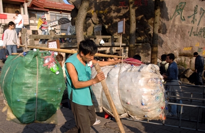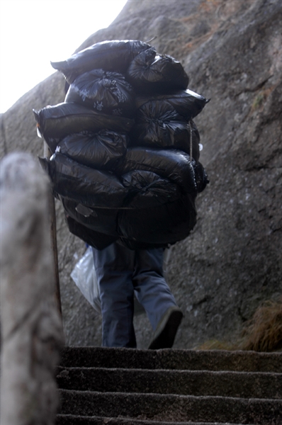 为保持黄山的清洁,平凡的清洁工们,跟在游人后面捡垃圾,游客们随意乱丢的垃圾全都是由他们肩挑人扛地来搬运和清理,维护着黄山的优美环境。