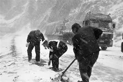 10年30日,新疆哈密省道303线天山路段司乘人员和交警在清理路面积雪。当日,受冷空气入侵影响,新疆哈密北部出现风雪天气,省道303、302线部分路段出现积雪、结冰和大雾,造成交通受阻。当日凌晨,新疆哈密交通管理分局立即启动应急预案,工程抢险车辆和人员全员出动,清除路面积雪。经过6个多小时的抢险,省道303线天山路段单向抢通。常农 摄