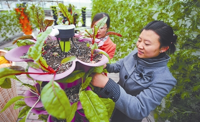 10月30日,在甘肃省高台县现代农业科技示范园智能温室内,技术管理员李娟(右)在管护盆栽蔬菜。