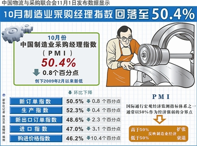 11月1日,中国物流与采购联合会发布数据显示,10月份中国制造业采购经理指数PMI为50.4%,环比回落0.8个百分点,这是该指数经历前两月小幅回升后,再次转为下跌,并创下2009年2月以来新低。中国物流与采购联合会副会长蔡进表示,当前的PMI数据依然保持在50%以上,反映经济维持适度增长态势,但已进入趋势性回调阶段。四季度经济增速仍有继续下调可能。