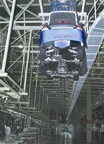 随着中国经济持续、稳定、健康发展,国内汽车产销量大幅度快速提升。一汽大众作为合资企业的代表,成为中国市场一颗耀眼的明星。图为一汽大众奥迪生产线。