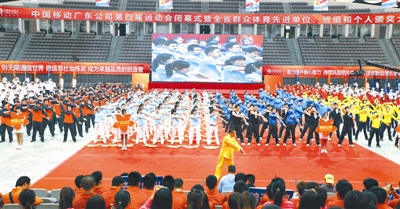 公司高度重视员工健康,注重群众体育运动。图为1000多名员工在中国移动广东公司第四届运动会闭幕式上表演天龙八部操。