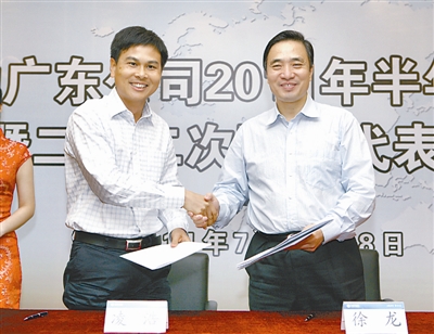 中国移动广东公司总经理徐龙(右)代表行政方和工会主席凌浩代表职工方签订集体合同。