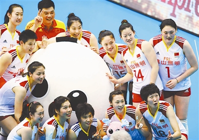 11月6日,中国队队员们和教练赛后一起与吉祥物合影,庆祝胜利。新华社记者 季春鹏 摄