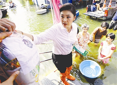 11月7日,泰国总理英拉抵达曼谷被洪水淹没的居民区,视察灾情并为受灾民众分发食物。吉平 供图