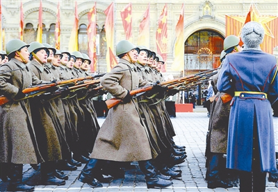 当地时间11月7日,俄罗斯莫斯科红场举行盛大游行,纪念红场阅兵70周年。1941年11月7日,在德国法西斯军队兵临莫斯科城下之际,苏联军队在红场上举行了阅兵式,参加阅兵式的部队在阅兵完毕后直接开赴前线。肖劼 供图