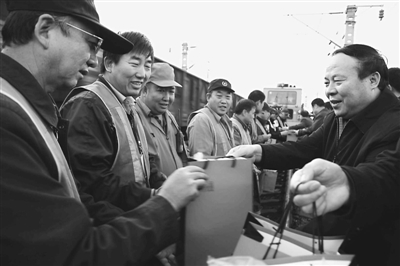 11月8日,太原铁路局工会主席杨志华正在给参加抢修的职工发放慰问品。在南同蒲大维修施工中,太原铁路局领导深入施工一线,为参战职工送上了慰问金和猪肉、蔬菜、胶鞋、水杯等慰问品,极大地鼓舞了参战职工的干劲儿。