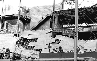 11月8日,在美国纽约市布鲁克林区,一幢位于布莱顿海滩正在建设中的大楼突然倒塌。纽约消防部门表示,倒塌事故中有5人受伤,其中一人生命垂危,还有两人伤势较重。谢涛 供图