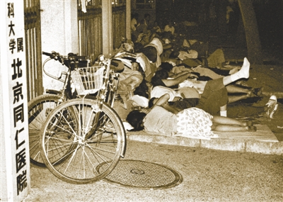 1995年,同仁医院门外,等待第二天排队挂号的人们。 CFP供图