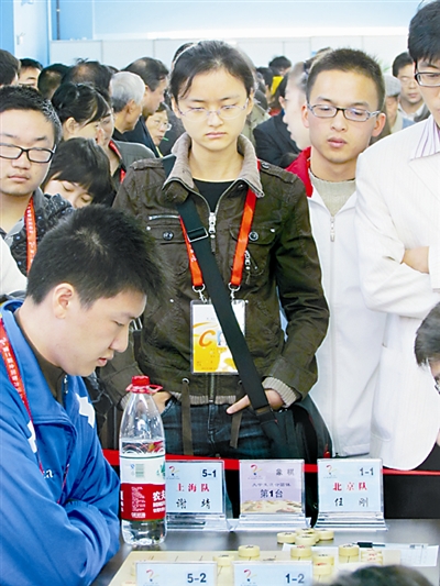 象棋比赛吸引了大量棋迷观赛,全国女子冠军唐丹(站立者中)也在其中。本报记者 宋澎 摄