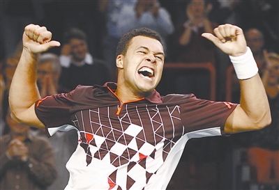 11月12日,法国选手特松加庆祝胜利。当日,在巴黎网球大师赛男单半决赛中,特松加以2比1战胜美国选手伊斯内尔,晋级决赛。 新华社/路透