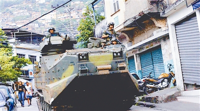 11月13日凌晨,为迎接2014年巴西世界杯,巴西出动3000名全副武装警察,在装甲车和直升机配合下,进入里约热内卢最大贫民窟——罗奇那打击贩毒分子。过去30年间,罗奇那贫民窟一直处于贩毒集团控制下。谢涛 供图