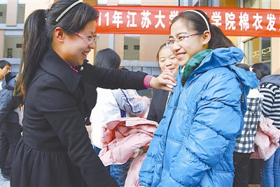 11月14日,江苏大学电气学院的贫困学生正在开心地试穿学校发放的新羽绒服。当日,江苏大学开展“爱心棉衣温暖贫困学子”活动,向22个学院的595名大一年级贫困生免费发放了新羽绒服。
