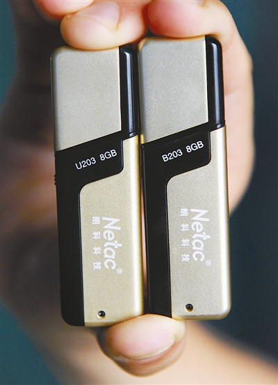 某公司的工作人员从中关村一家电子产品柜台购买的两款朗科B203系列U盘(10月20日摄)。而朗科公司服务热线工作人员称,B系列产品有专门的供应渠道,并不零售。