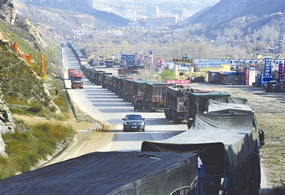 从陕西省神木县店塔镇开始,到陕晋交界处的黄河边上,仅仅90公里长的一段运煤大通道上,几乎每天都有数千辆拉煤车堵在路上排队等候通行。一位司机介绍,11月的一天,因为下雨,短短15公里路整整走了3天时间。邓小卫 摄