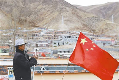 11月16日,在青海玉树结古镇民主路边,藏族妇女阿白的丈夫张云悌老人在自家的屋顶组装电视天线。