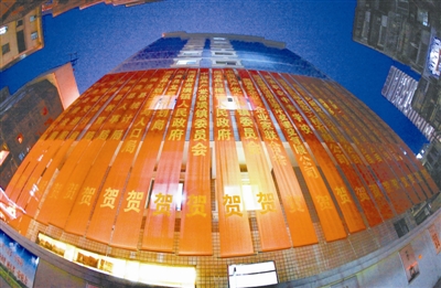 11月17日,福州市鼓楼区一条巷子内一家私房菜馆会所开业,大楼墙面上的众多单位祝贺条幅吸引了路人关注,并引起网友热议围观,称之为“最牛开业条幅”。郑帅 摄