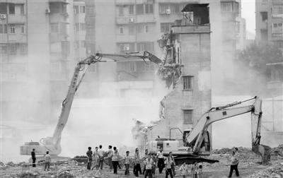 据了解,现在与杨箕联社签订协议并已迁出的户数达到99%,而未与杨箕联社达成补偿协议的住户有17户,未交出房屋28 栋。上述拒绝搬迁的17 户已经全部进入诉讼或执行程序。而本次被执行强制拆迁的是其中已进入执行程序的三案。郭新 摄
