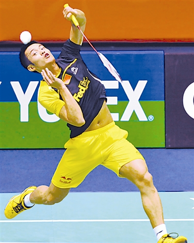 11月17日,中国选手林丹在比赛中回球。当日,在2011年香港羽毛球公开赛男子单打第二轮比赛中,中国选手林丹以2比0战胜中国香港选手黄永棋,晋级下一轮。新华社记者 卢炳辉 摄