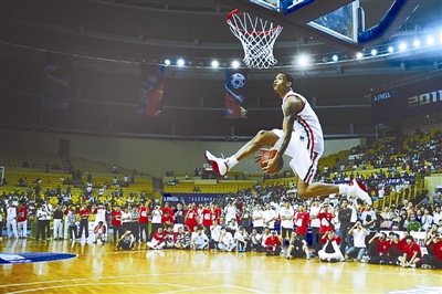 2011年10月29日,在广东省佛山市举行的全国首届城市篮球邀请赛决赛中,佛山龙狮新外援扣篮王格林正式亮相,展现扣篮绝技。Mars/CFP