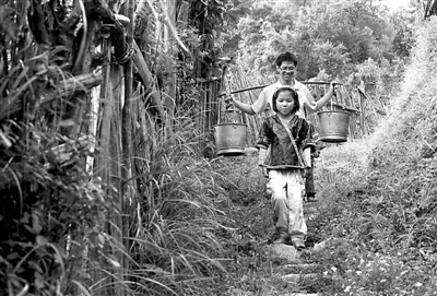 2011年9月23日,在广西融水苗族自治县安太乡培秀苗寨,一名志愿者为留守儿童挑水。龙涛摄