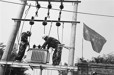 日前,河北省深州市供电公司“共产党员服务队”正在农网升级改造的一线紧张作业。据悉,该公司将投资2700万元,新建改造农村配电变压器台区341个,其中包括109个农排台区,升级改造46个行政村,新建改造线路119.648千米。张芹 摄