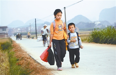 11月18日下午放学后,流沙镇中心小学5年级的罗粤尹和幼儿园大班的弟弟罗兰庆步行回家,这是因为平时接送他们的非法营运面包车不敢上路了。如果路上不能碰上回村的“顺风车”,他们将要步行2个多小时才能到达10多公里之外的家。