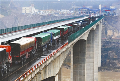 在陕晋交界处长度为754米的黄河大桥上,前往山西方向的车辆行驶缓慢(11月8日摄)。为了不因车辆载重造成大桥受力不均,由陕入晋方向的运货车只允许单车道通行。被阻塞的运煤重型车长时间滞留在隧道内或黄河大桥上,一旦发生自燃或垮塌,后果不堪设想。